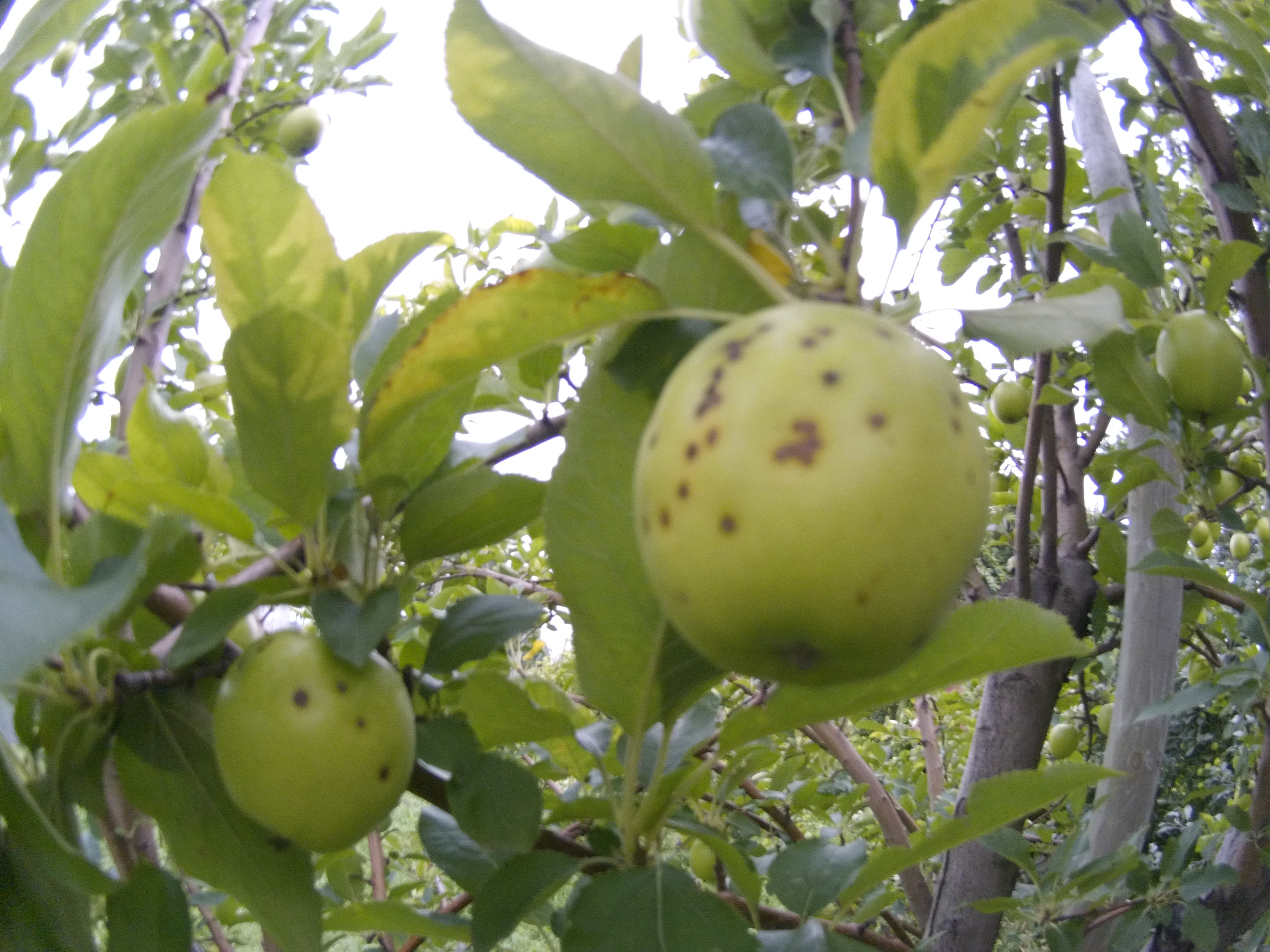 これが病気になっちゃったりんご。「王林」という品種だけれど、見ての通り、黒い点々が付いている。これが黒星病。この黒い部分から腐っておいしくなくなる。ということで、見つけ次第摘果することになる。